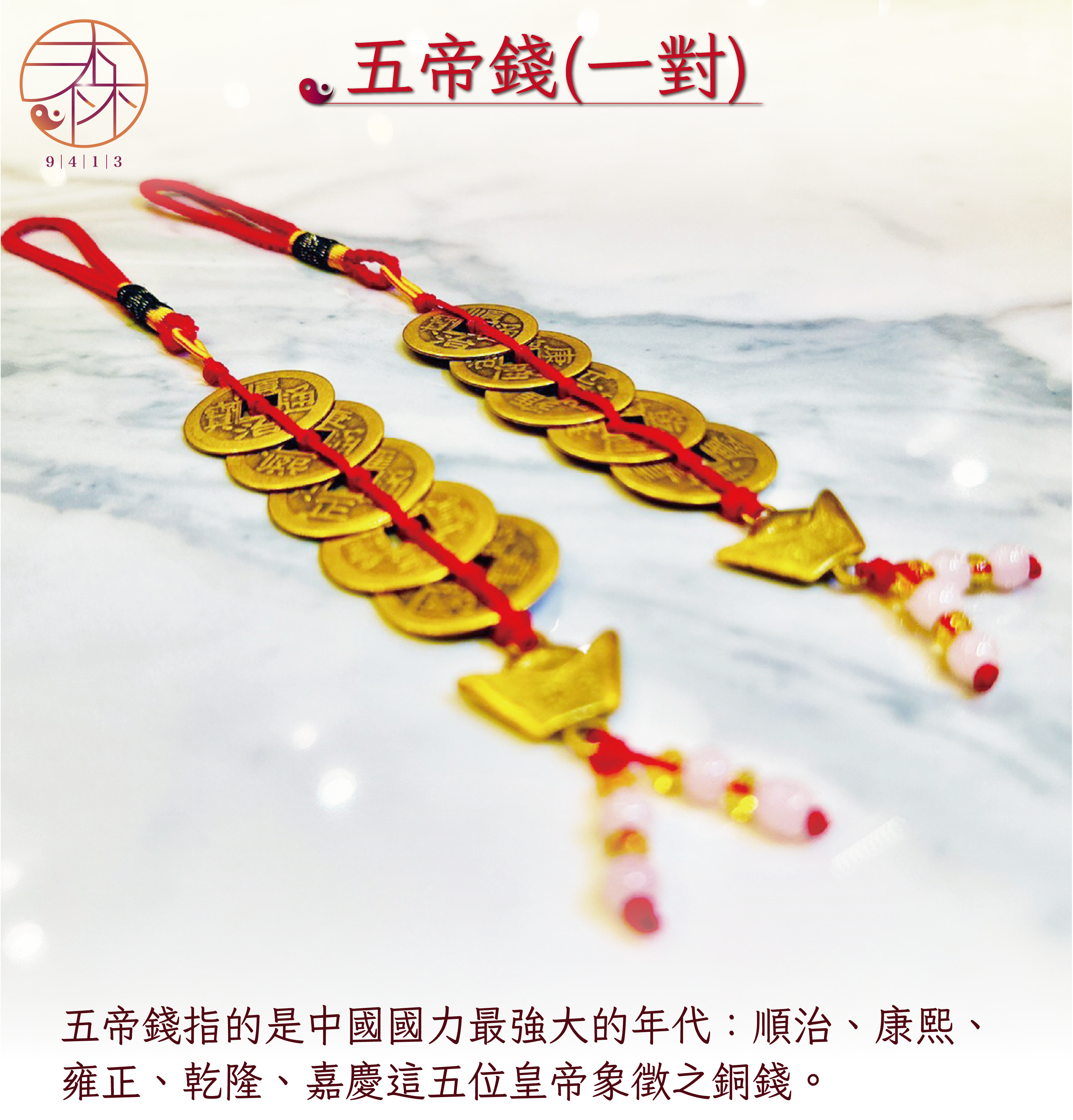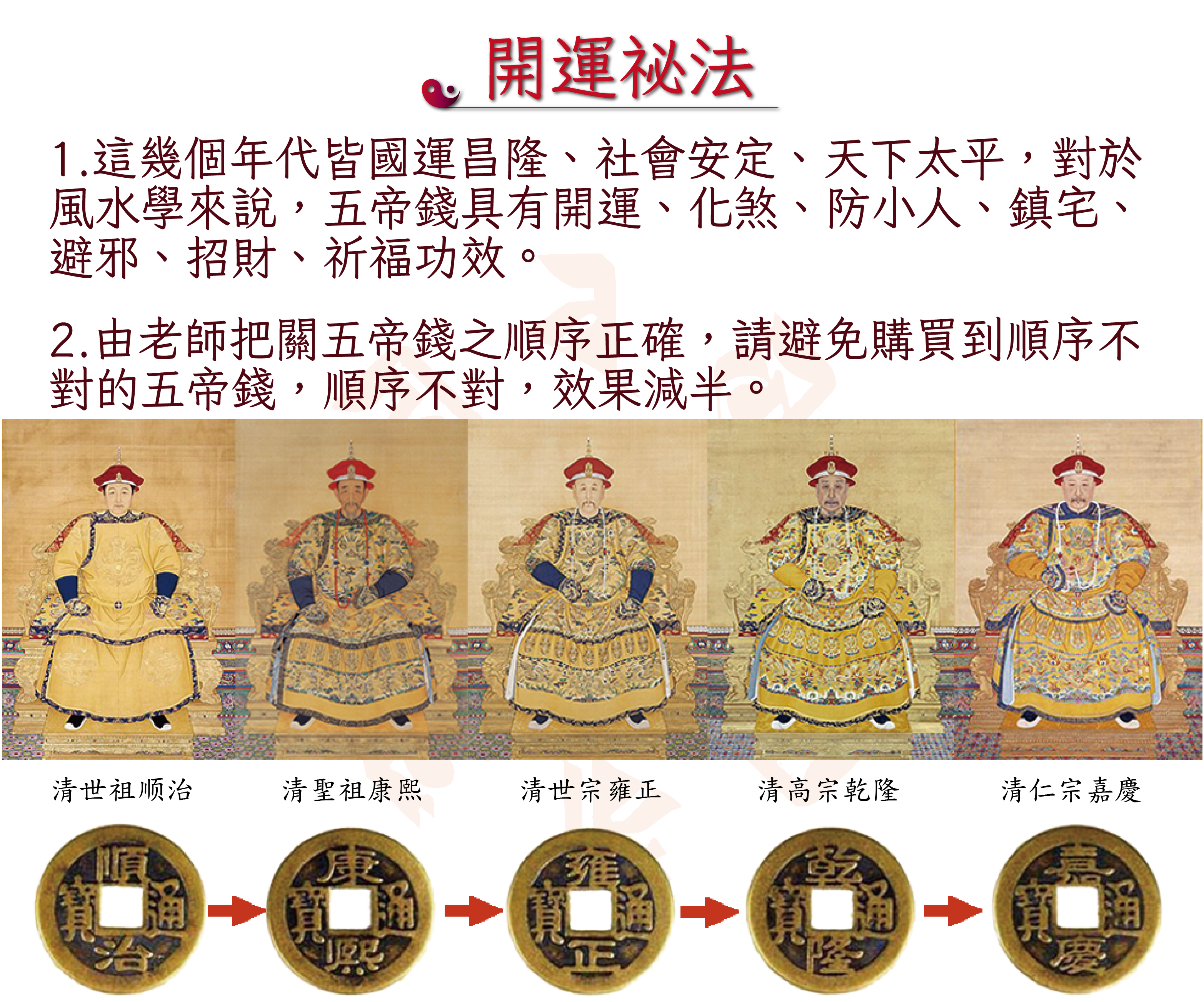 五帝錢具有開運、化煞、防小人、鎮宅、避邪、招財、祈福功效。五帝錢指的是中國國力最強大的年代:順治、康熙、雍正、乾隆、嘉慶這五位皇帝象徵之銅錢。這幾個年代皆國運昌隆、社會安定、天下太平。 由老師把關五帝錢之順序正確,請避免購買到順序不對的五帝錢,順序不對,效果減半。