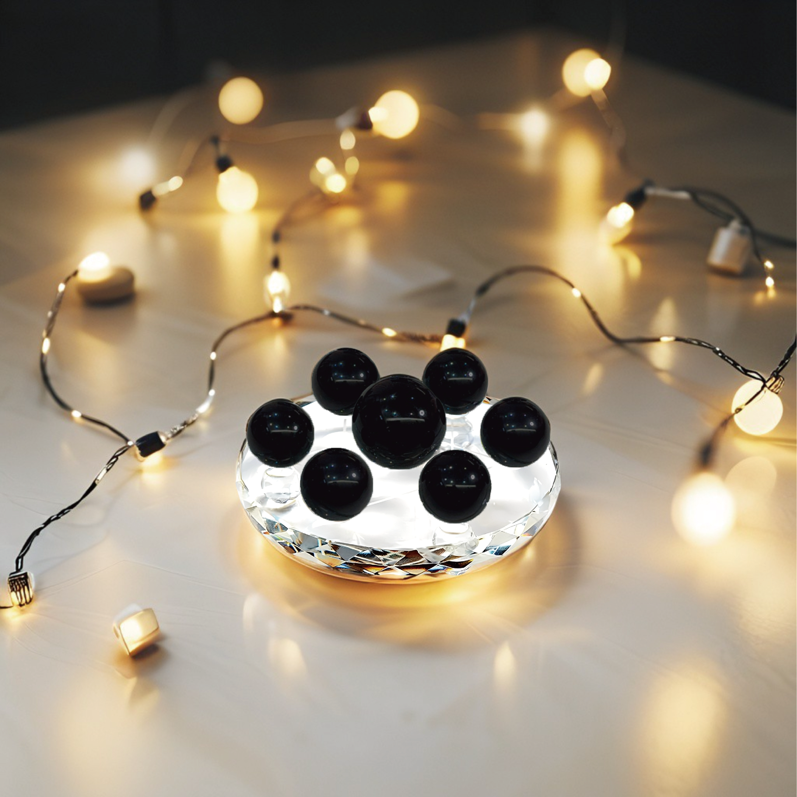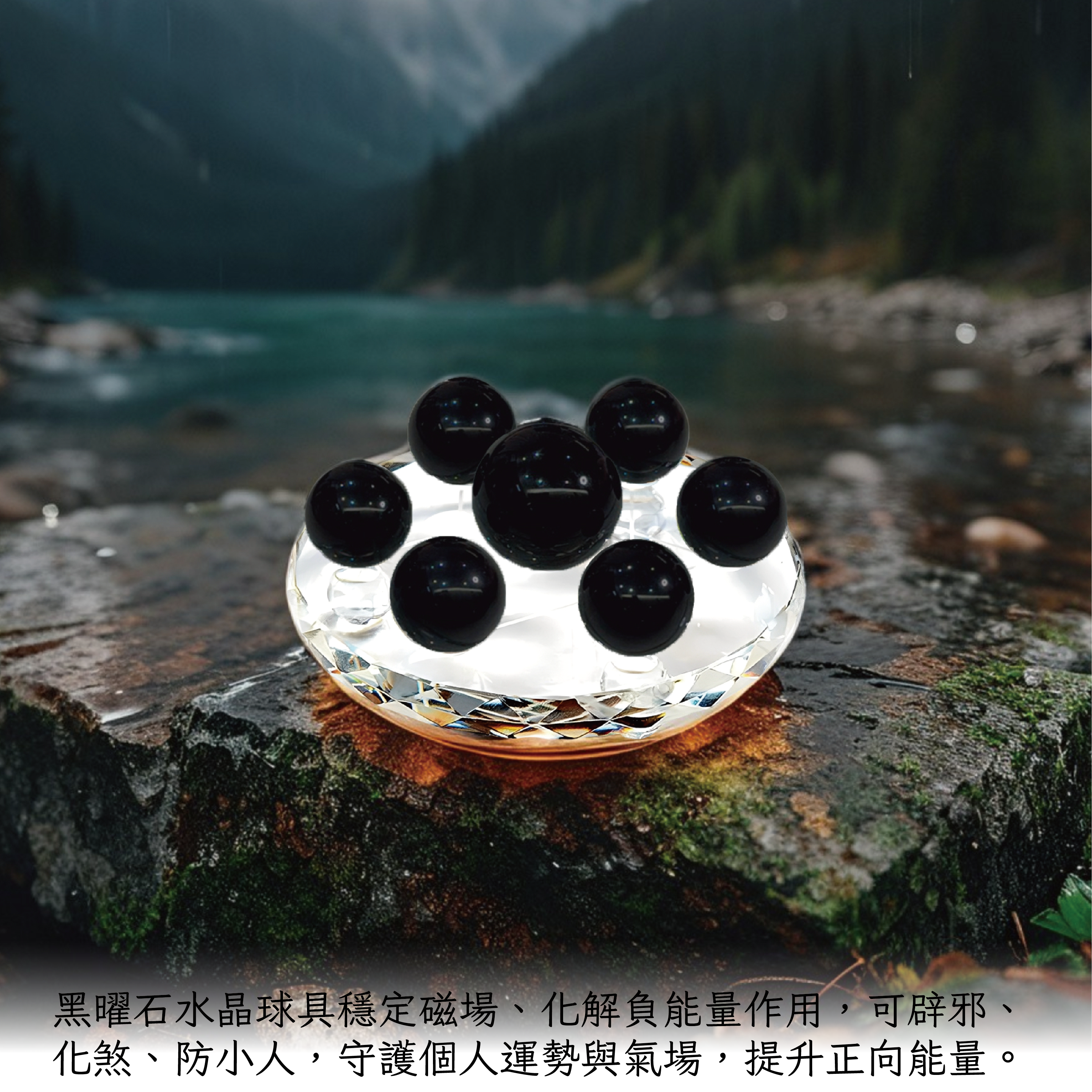 黑曜石水晶球具穩定磁場、化解負能量作用,可辟邪、化煞、防小人,守護個人運勢與氣場,提升正向能量。