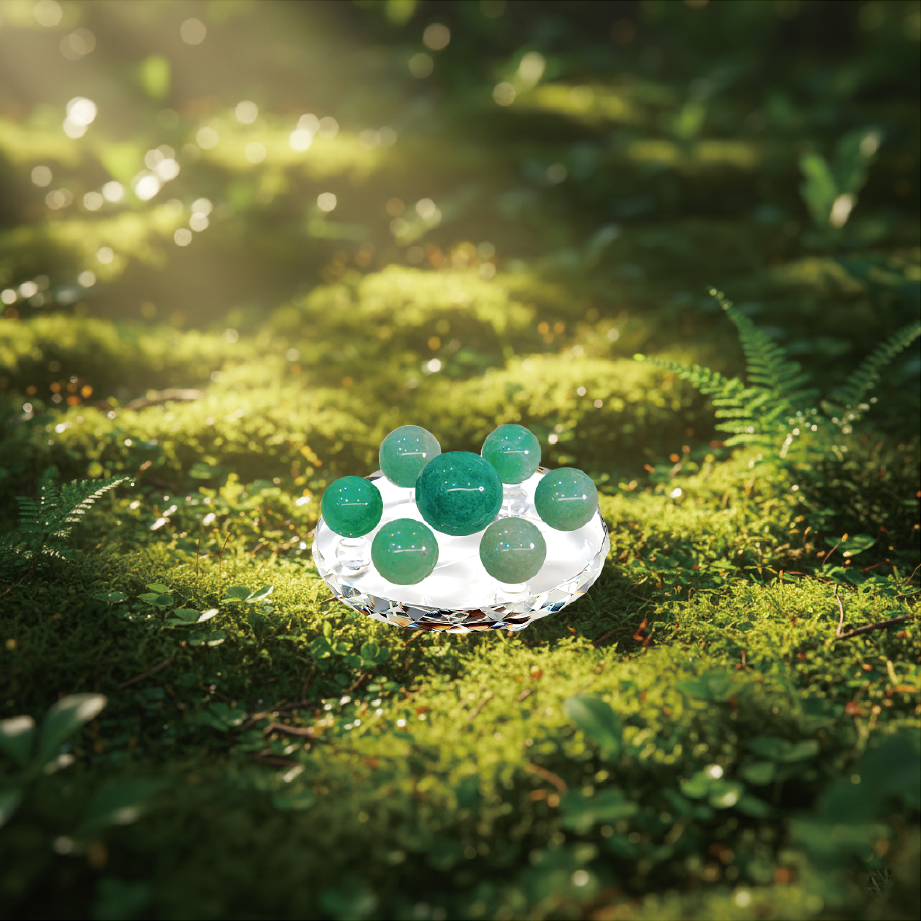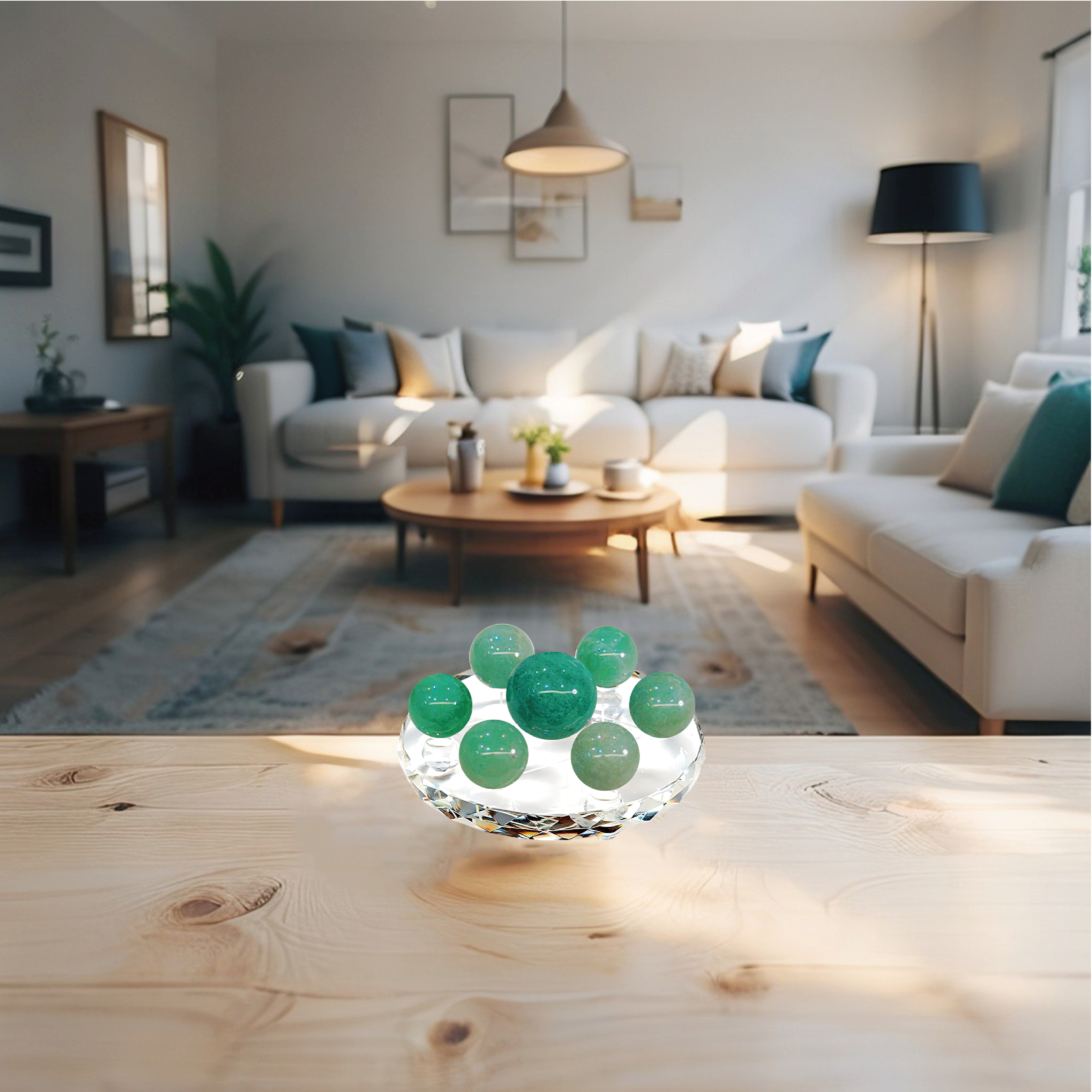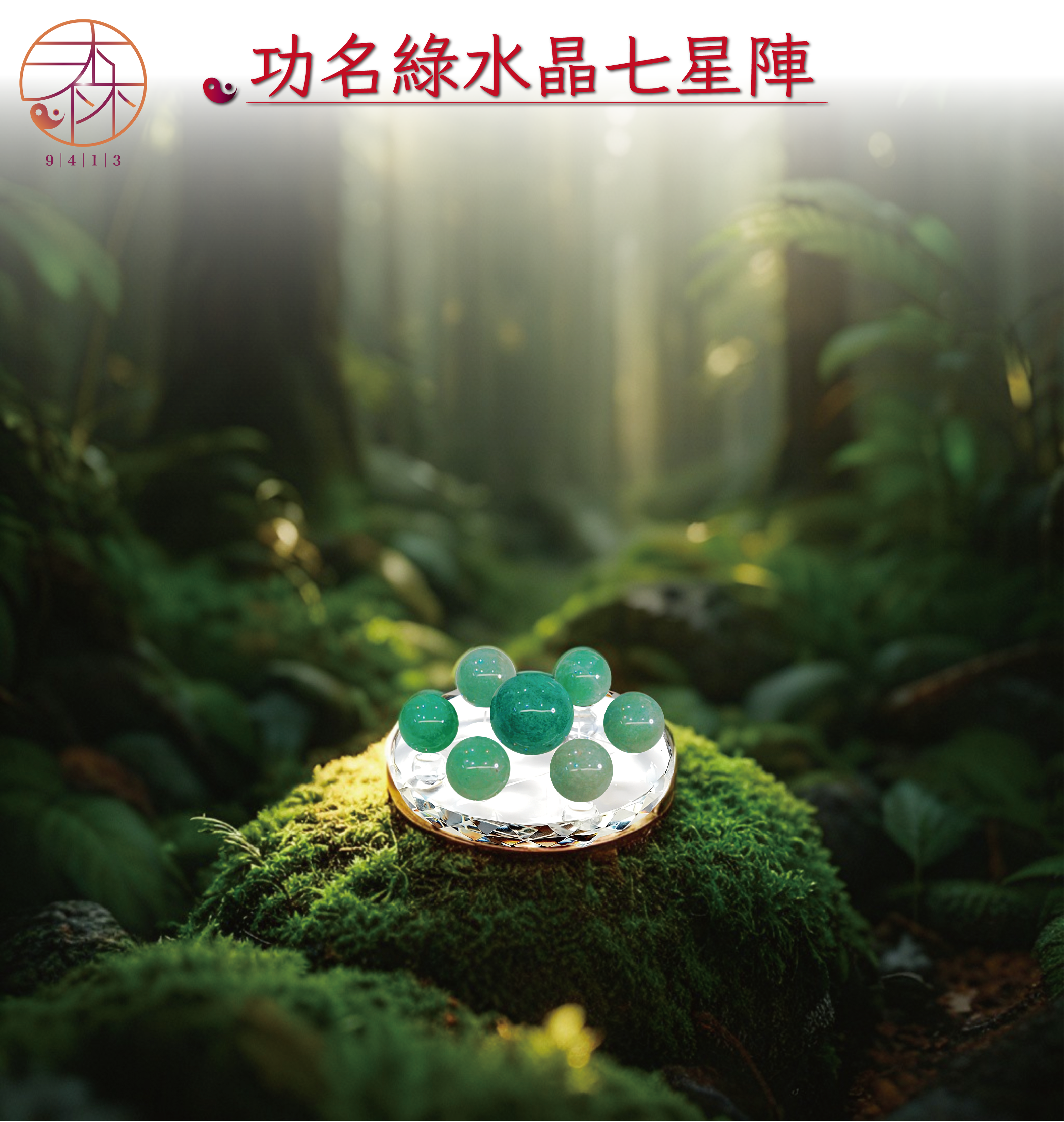 綠水晶七星陣象徵生機與成長,擺放於文昌位或書桌上,可激發靈感、提升思緒與智慧,幫助集中精神、化解負能量,並增強財運與人際運。