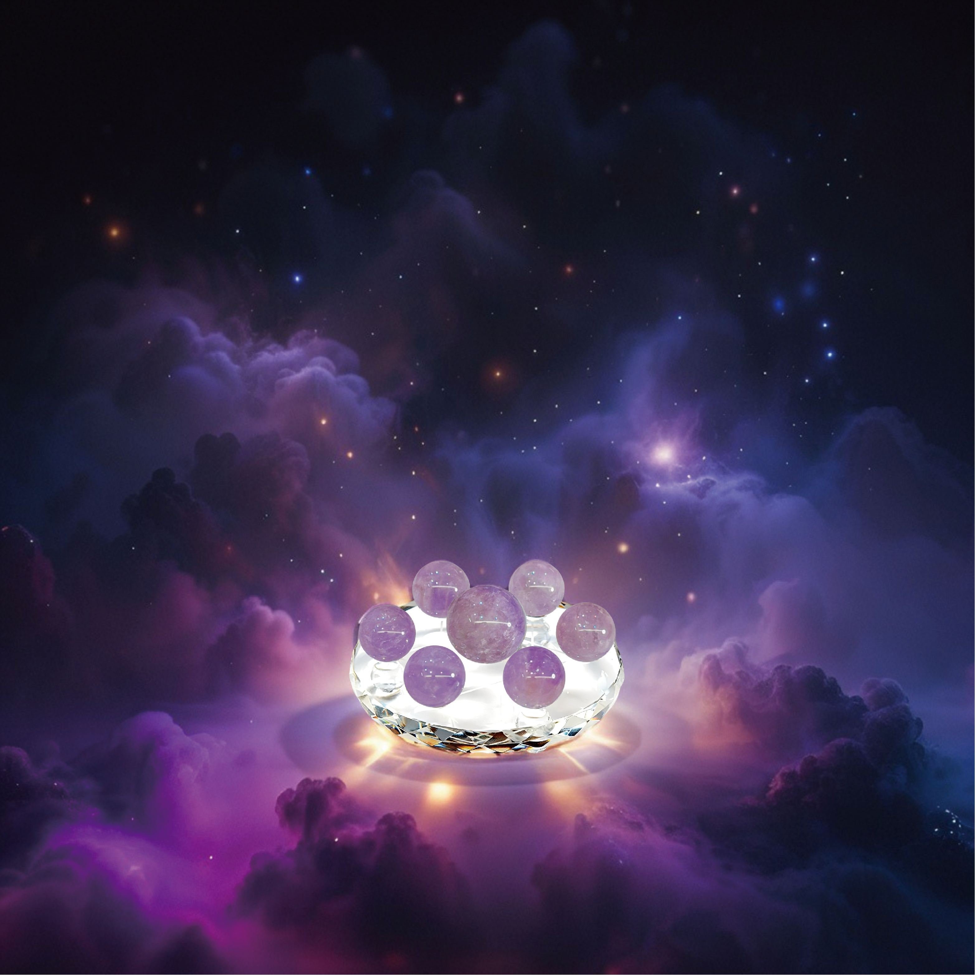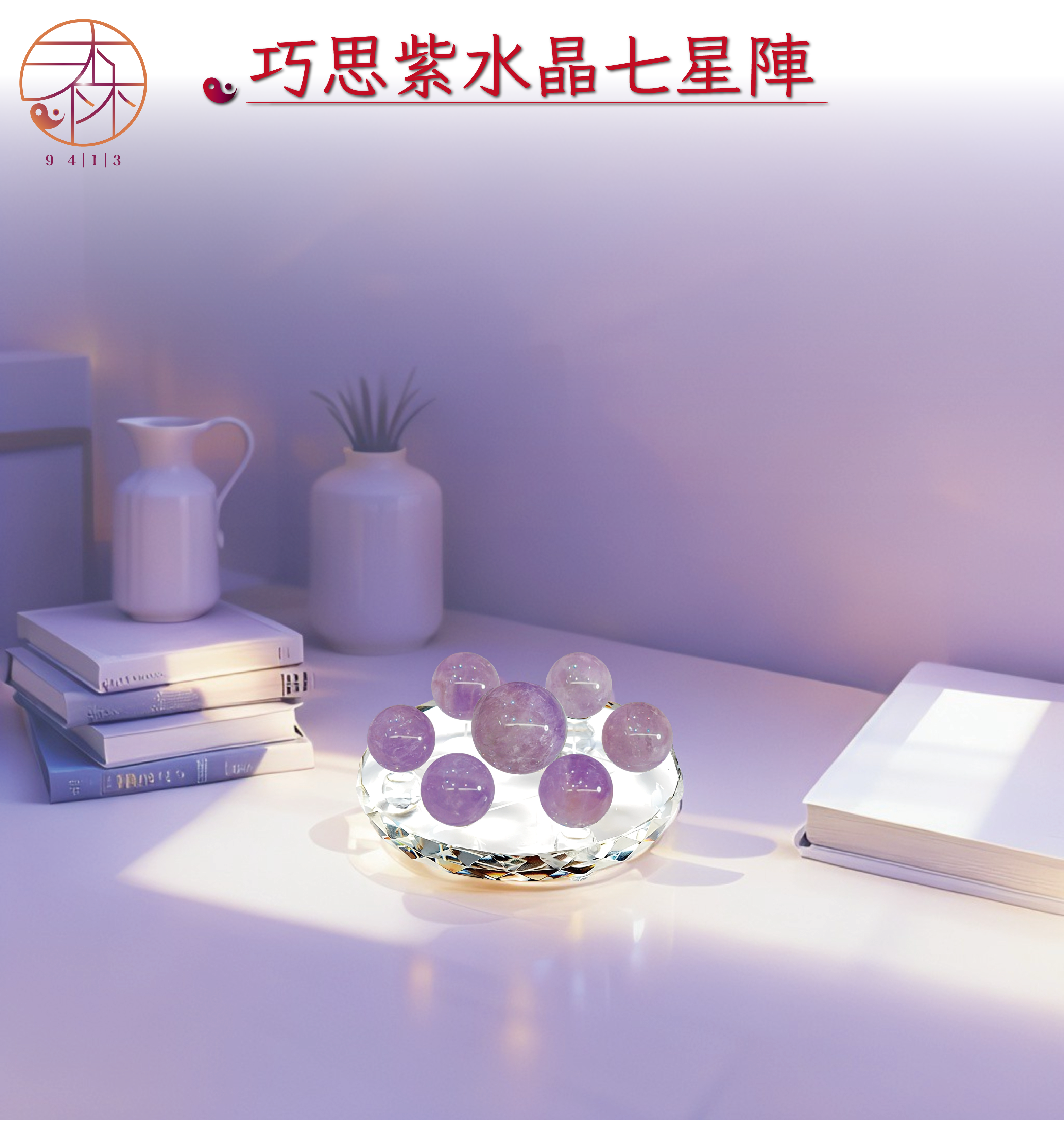 紫水晶七星陣象徵智慧與集中精神,擺放於書桌或辦公桌上,可助思考清晰、集中專注,啟發靈感並穩定心神。