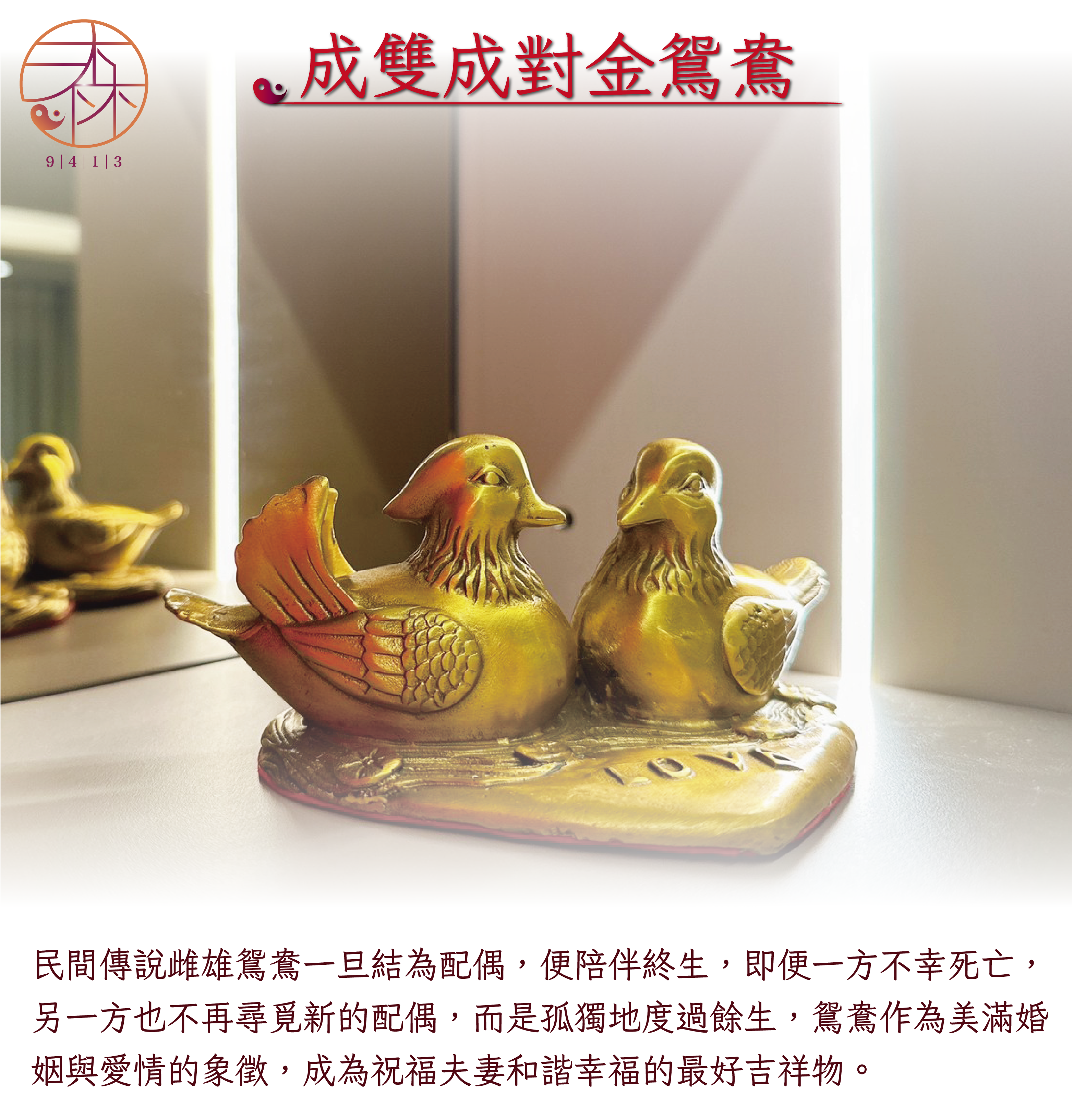 招桃花!招好緣必備!民間傳說雌雄鴛鴦一旦結為配偶,便陪伴終生,即便一方不幸死亡,另一方也不再尋覓新的配偶,而是孤獨地度過餘生,鴛鴦作為美滿婚姻與愛情的象徵,成為祝福夫妻和幸福的最好吉祥物。