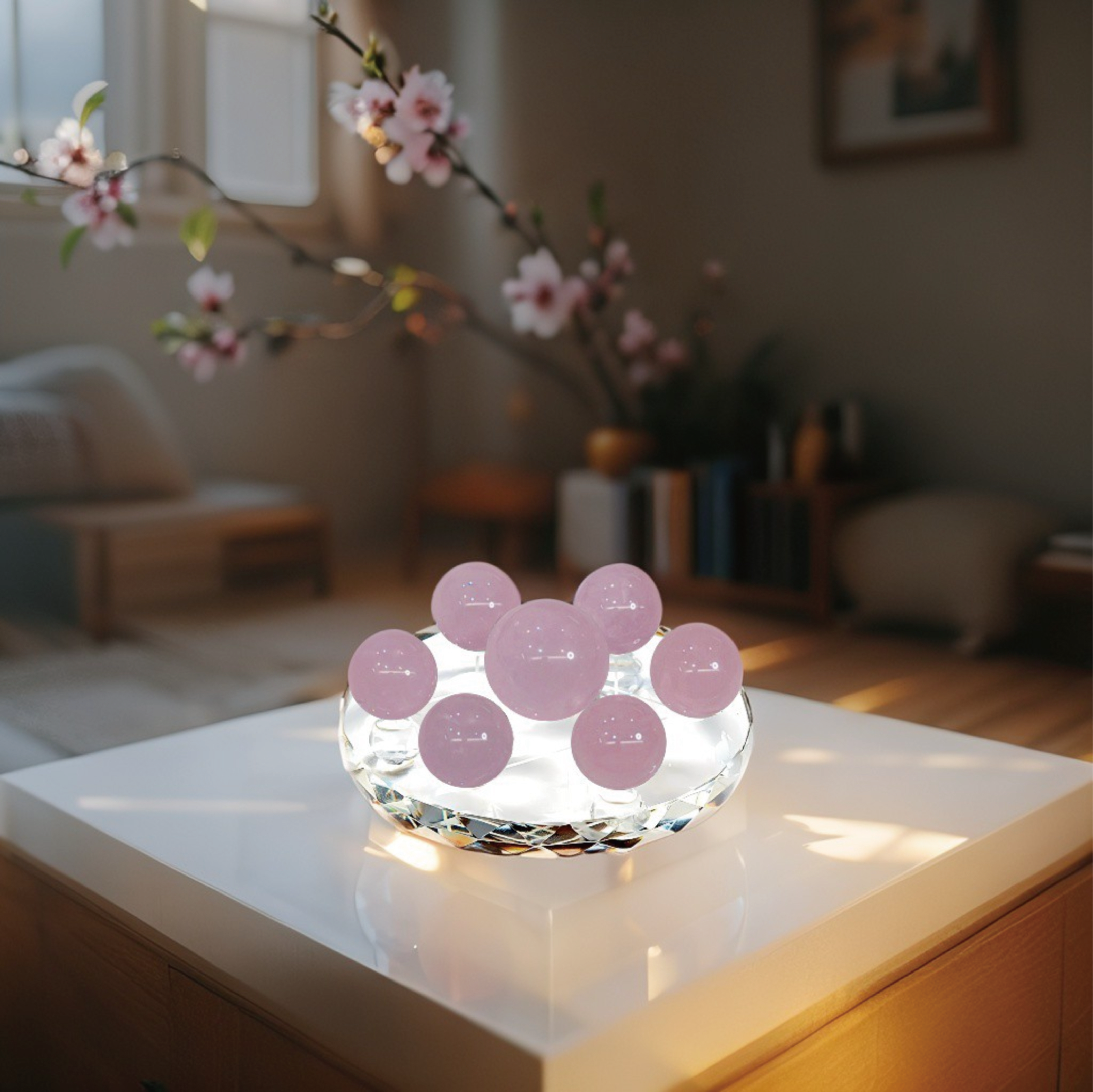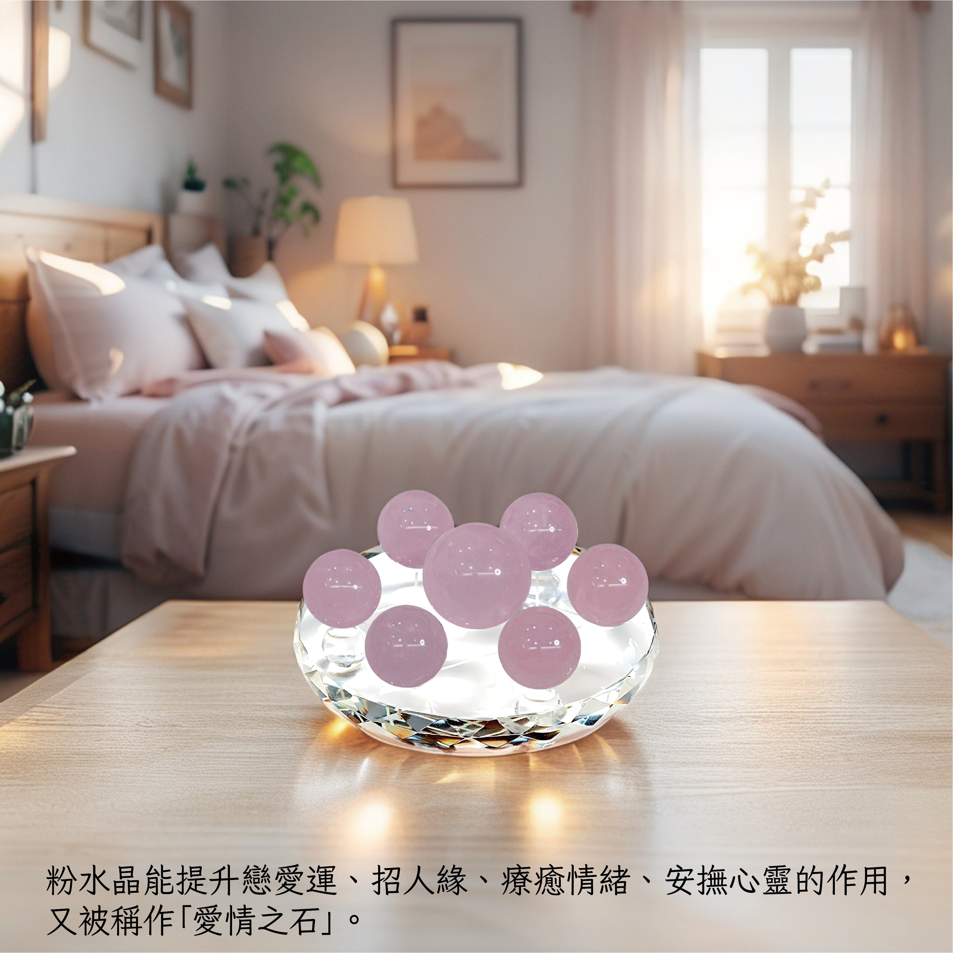 粉水晶象徵愛與人緣,擺放於臥室或辦公桌上,可提升戀愛運、招人緣,療癒情緒並安撫心靈,又被稱作「愛情之石」。
