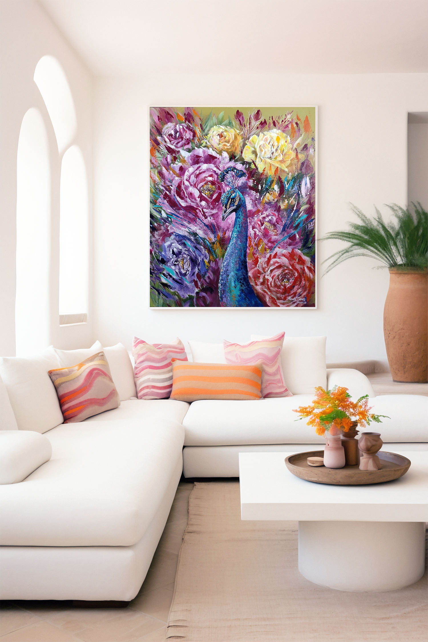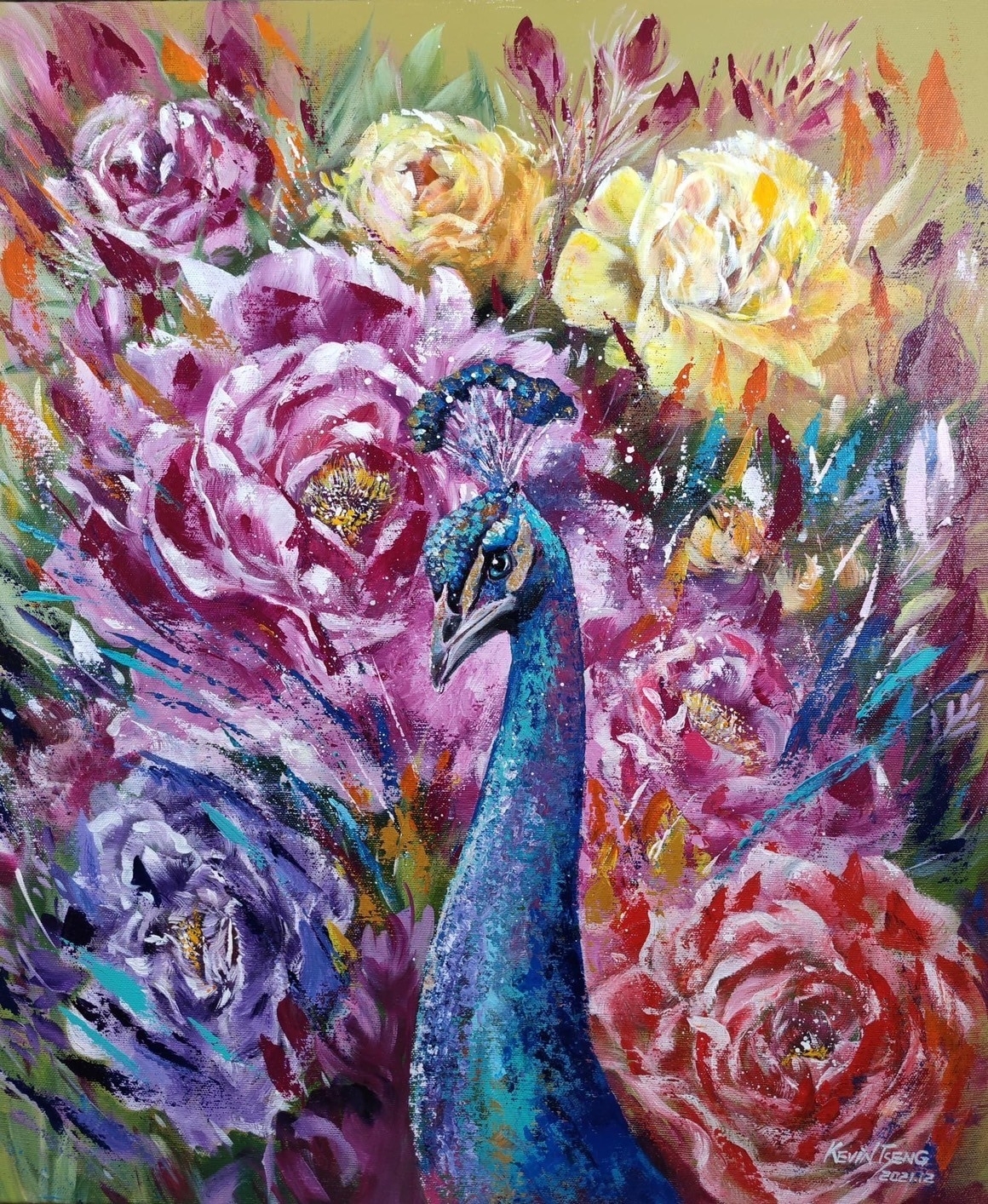 ※華麗高貴的孔雀,象徵祥瑞與榮華,搭配盛開的花卉,營造出喜氣洋洋的氛圍,寓意「花好緣美,喜慶吉祥」~