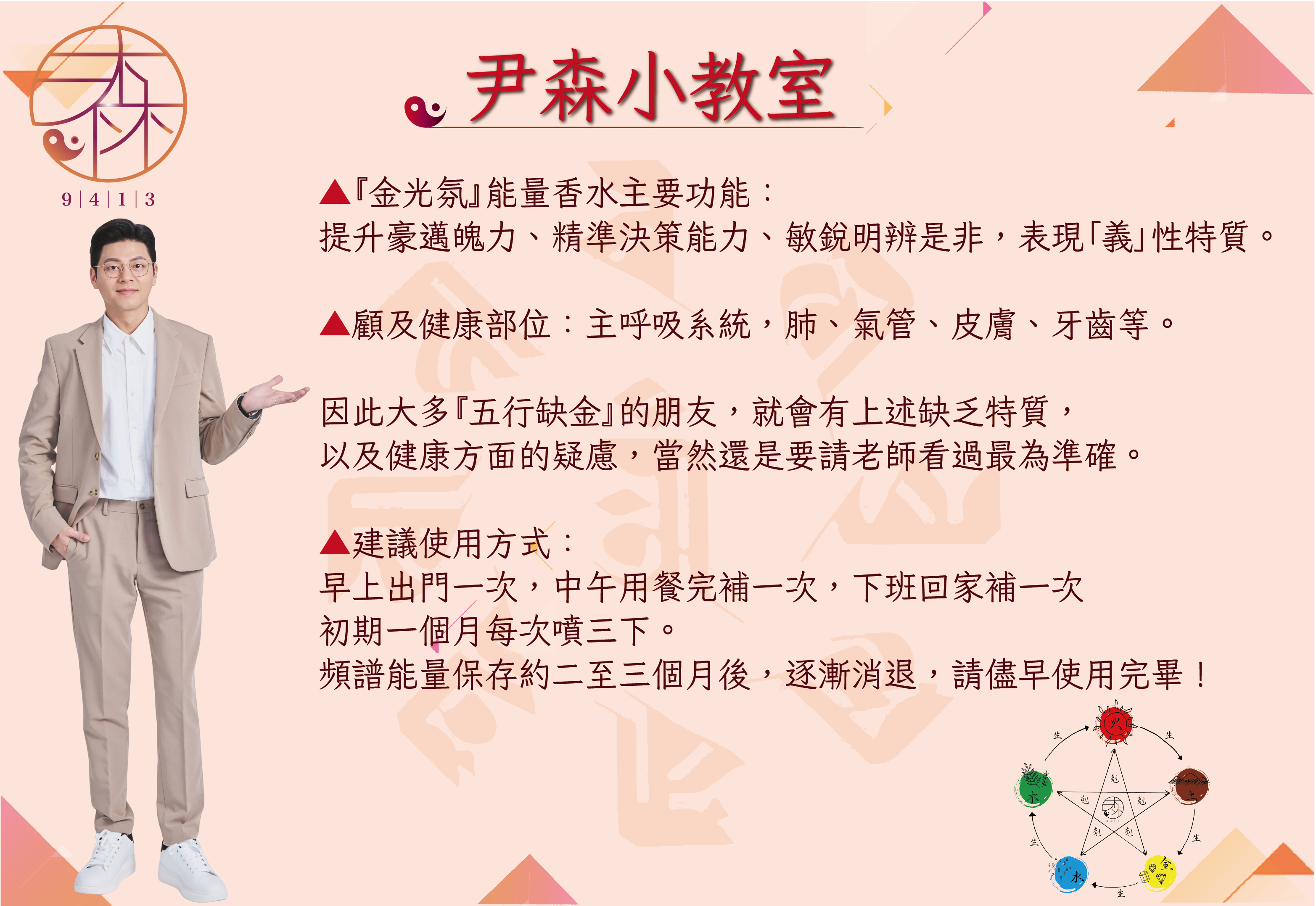 金光氛主要功能:提升豪邁魄力、精準決策能力、敏銳明辨是非,表現「義」性特質。
