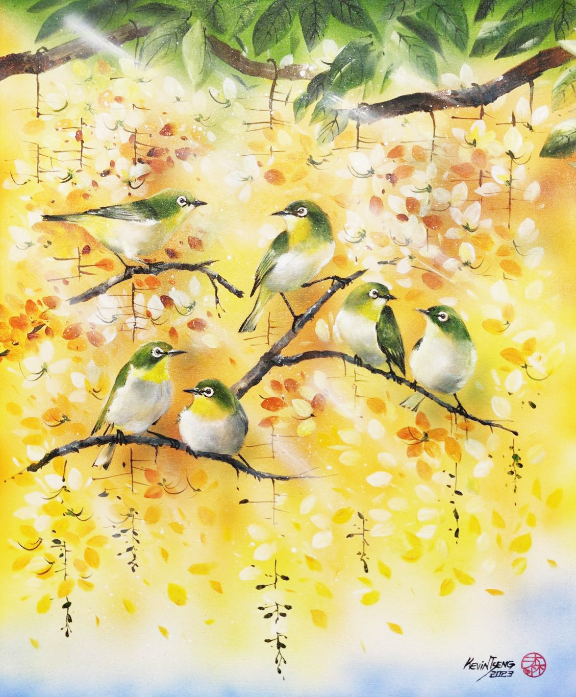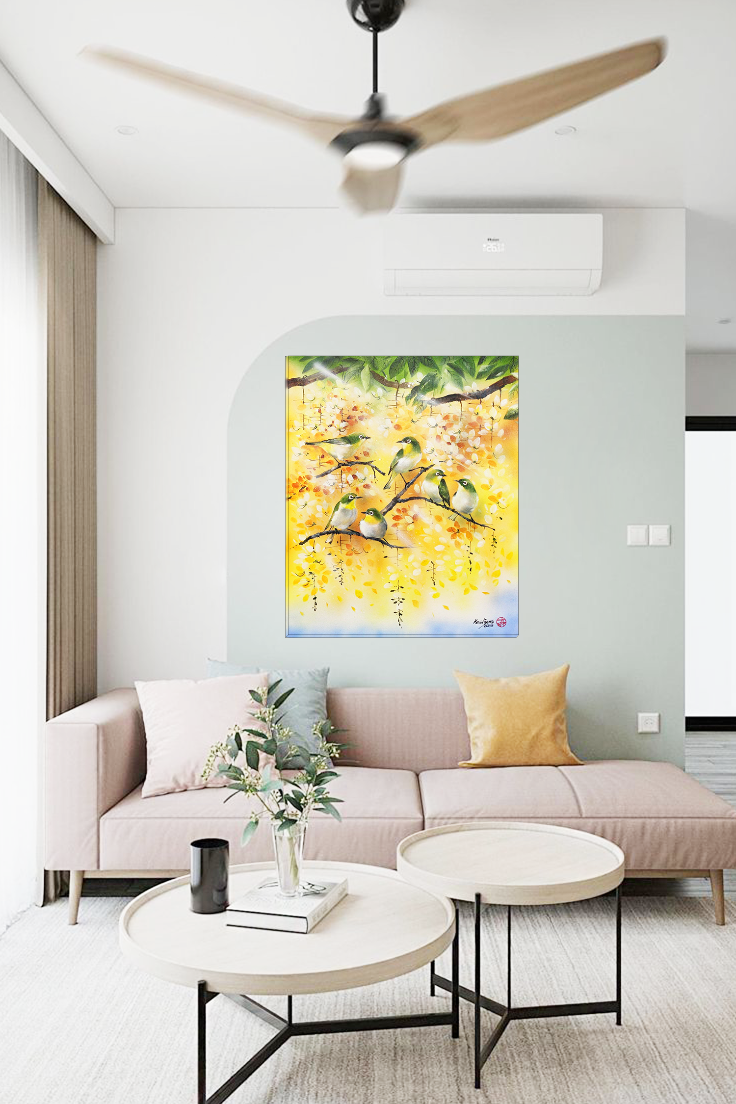 ※以金黃雨飄逸的樹葉象徵財富與豐收,搭配六隻寓意吉祥的鳥兒,代表「六吉臨門」,營造出財運亨通、喜迎富貴的美好意象~